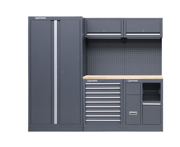 Cet ensemble en acier extrêmement stable, associé à un plan de travail en Rubberwood très robuste, améliore votre productivité et votre efficacité au sein de votre atelier ou votre garage. Tous les meubles sont équipés d’un système de verrouillage individuel centralisé, pour une sûreté permanente accrue. Les parois sont perforées au standard européen, ce qui les rend idéales pour suspendre crochets et autres outils pratiques. Le plan de travail est fixé à une hauteur ergonomique de 95 cm, pour une position de travail plus confortable que les plans de travail standards. Toutes les unités de bases fixes reçoivent des pieds réglables, pour faire face aux sols les moins d’aplomb.