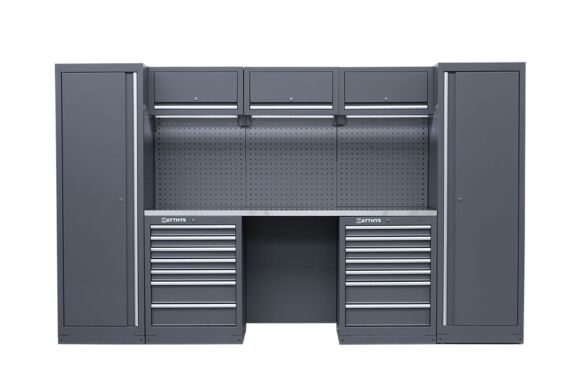 Cet ensemble en acier extra robuste et extrêmement stable, associé à un plan de travail avec revêtement inoxydable très robuste, améliore votre productivité et votre efficacité au sein de votre atelier ou votre garage. Tous les meubles sont équipés d’un système de verrouillage individuel centralisé, pour une sûreté permanente accrue. Les parois sont perforées au standard européen, ce qui les rend idéales pour suspendre crochets et autres outils pratiques. Le plan de travail est fixé à une hauteur ergonomique de 95 cm, pour une position de travail plus confortable que les plans de travail standards. Toutes les unités de bases fixes reçoivent des pieds réglables, pour faire face aux sols les moins d’aplomb.