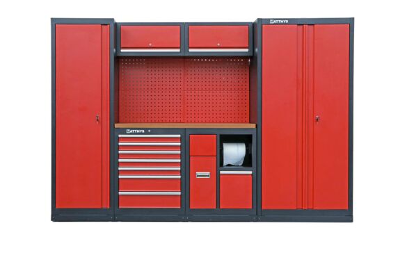 Cet ensemble en acier extrêmement stable, associé à un plan de travail en MDF très robuste, améliore votre productivité et votre efficacité au sein de votre atelier ou votre garage. Tous les meubles sont équipés d’un système de verrouillage individuel centralisé, pour une sûreté permanente accrue. Les parois sont perforées au standard européen, ce qui les rend idéales pour suspendre crochets et autres outils pratiques. Le plan de travail est fixé à une hauteur ergonomique de 95 cm, pour une position de travail plus confortable que les plans de travail standards. Toutes les unités de bases fixes reçoivent des pieds réglables, pour faire face aux sols les moins d’aplomb.