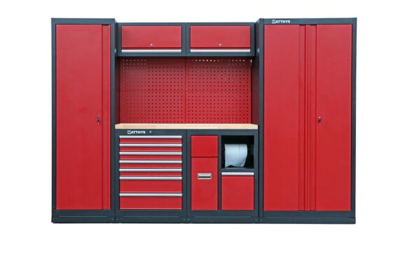 Cet ensemble en acier extrêmement stable, associé à un plan de travail en Rubberwood très robuste, améliore votre productivité et votre efficacité au sein de votre atelier ou votre garage. Tous les meubles sont équipés d’un système de verrouillage individuel centralisé, pour une sûreté permanente accrue. Les parois sont perforées au standard européen, ce qui les rend idéales pour suspendre crochets et autres outils pratiques. Le plan de travail est fixé à une hauteur ergonomique de 95 cm, pour une position de travail plus confortable que les plans de travail standards. Toutes les unités de bases fixes reçoivent des pieds réglables, pour faire face aux sols les moins d’aplomb.
