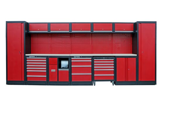 Cet ensemble en acier extrêmement stable, associé à un plan de travail avec revêtement inoxydable très robuste, améliore votre productivité et votre efficacité au sein de votre atelier ou votre garage. Tous les meubles sont équipés d’un système de verrouillage individuel centralisé, pour une sûreté permanente accrue. Les parois sont perforées au standard européen, ce qui les rend idéales pour suspendre crochets et autres outils pratiques. Le plan de travail est fixé à une hauteur ergonomique de 95 cm, pour une position de travail plus confortable que les plans de travail standards. Toutes les unités de bases fixes reçoivent des pieds réglables, pour faire face aux sols les moins d’aplomb.