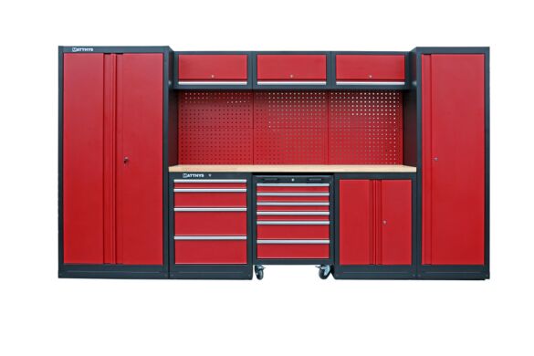 Deze uiterst stabiele staal constructie met een stevig Rubberwood werkblad verhoogt de productiviteit en efficiëntie in uw werkplaats of garage. Alle kasten zijn uitgerust met een individuele centrale vergrendeling, zodat deze altijd afsluitbaar zijn. Ook zijn de gereedschapswanden voorzien van de Europese standaard perforatie, ideaal dus om haakjes en andere handige tools aan op te hangen. De werktafel heeft een ergonomische werkhoogte van 95 cm, die u een comfortabelere werkhouding aanbiedt dan de standaard werkbanken. Alle vaste onderkasten zijn voorzien van verstelbare poten zodat zelfs de meest ongelijke vloeren geen probleem zullen vormen.